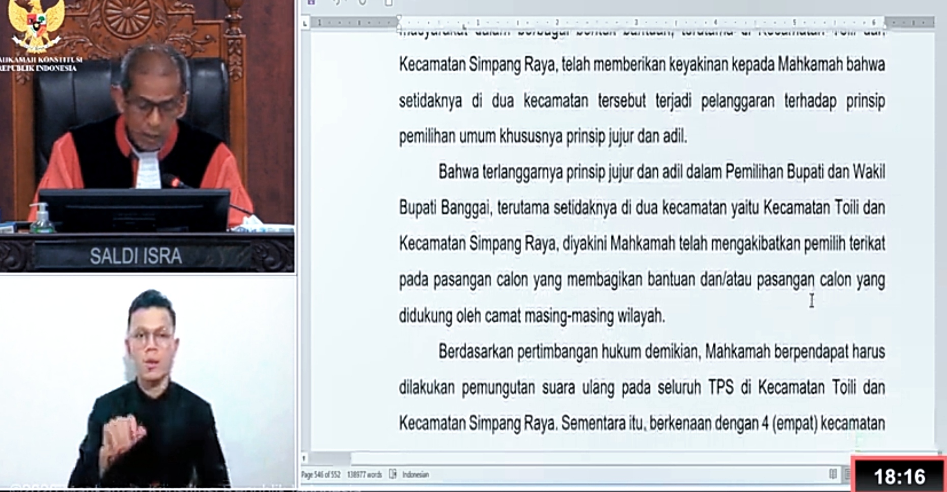 “Mahkamah berpendapat harus dilakukan pemungutan suara ulang pada seluruh TPS di Kecamatan Toili dan Kecamatan Simpang Raya,”ujarnya.