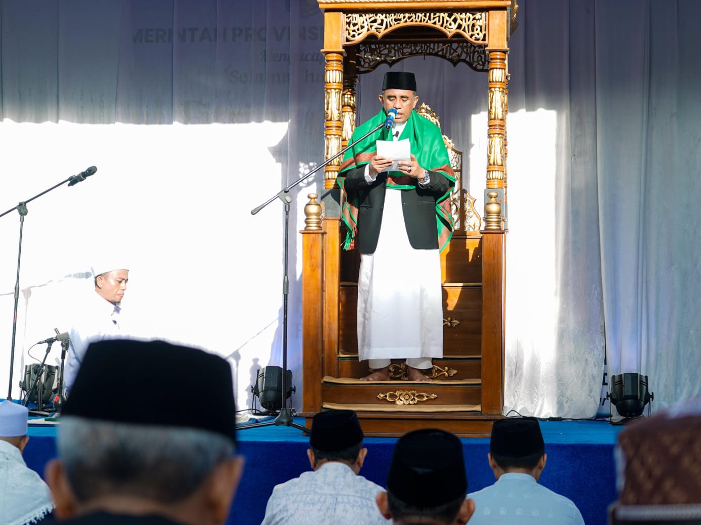 Suasana semakin khidmat saat Gubernur Anwar Hafid naik mimbar sebagai khatib, menyampaikan pesan-pesan spiritual yang mendalam.