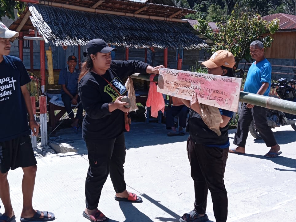 Dalam aksi tersebut, warga memblokir jalan dan memasang spanduk penolakan terhadap aktivitas PETI.
